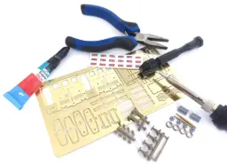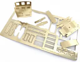 Piegare la carrozzeria utilizzando le pinze. Inserire il pianale e i gradini e saldarli da sotto. Posizionare e saldare i mancorrenti. Piegare leggermente le estremita del tetto seguendo le linee di incisione, quindi imprimere la curvatura e posizionarlo sulle 4 linguette e saldarlo. Inserire la carrozzeria sul telaio e saldare le linguette da sotto.